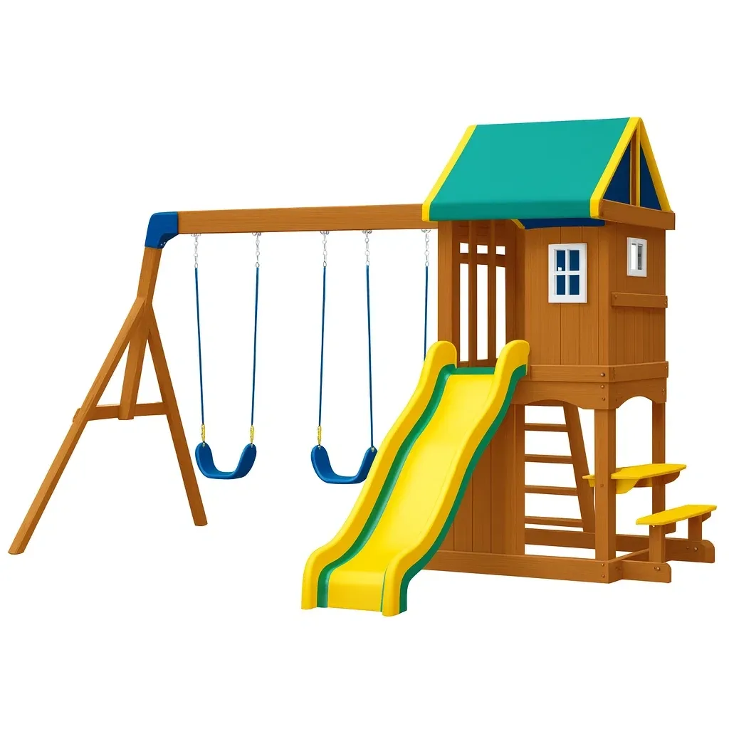 Équipement de terrain de jeu pour enfants avec toboggan et balançoire en plastique de couleur verte et beige